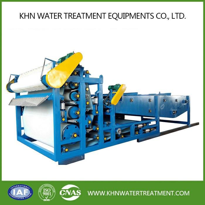 After the belt filter press fully mixes the sludge with a certain concentration of flocculant in the mixer, the small solid particles in the sludge condense into a larger floc, and free water is separated at the same time, and the sludge is transported to the concentration Gravity dewatering filter belt, under the action of gravity, forms sludge in a non-flowing state, and then is transported between the two filter belts. After pre-pressure, low pressure and high pressure, small to large compression force and shear force are applied. Then, the sludge is gradually squeezed to achieve the maximum degree of mud and water separation, and finally a filter cake is output